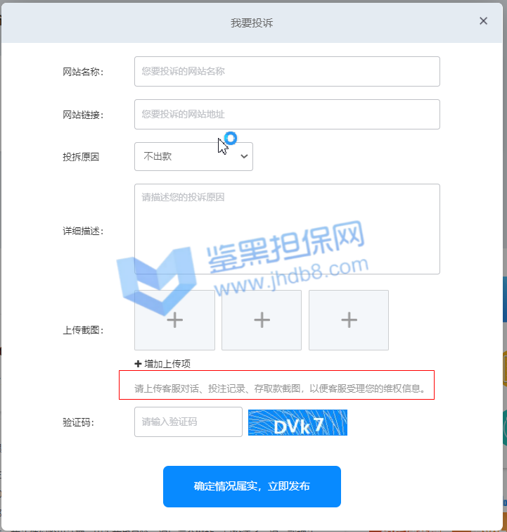 4.用户提交维权需为本人提交,若代替让人发布维权鉴黑担保网将拒绝受理;