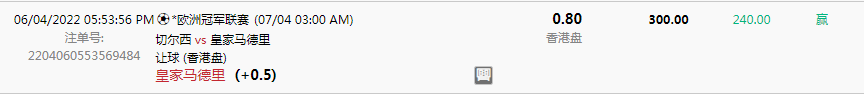 今天凌晨的欧冠的比赛,切尔西 vs 皇家马德里,自己是比较看好客场的皇马的,毕竟最近车子的状态很一般的,最终皇马不负所望,3:1直接赢球赢盘了,皇马的欧冠真的是可以信赖的,重注红了,真开心!!!