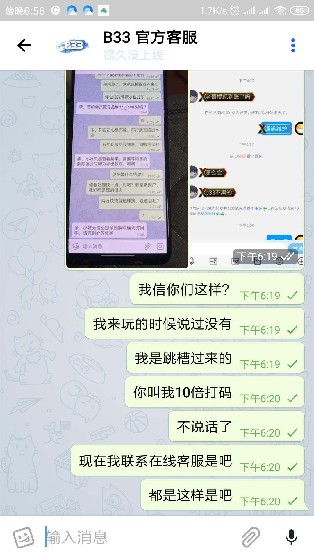 注册没几天!看一个山河直播,他推广b33很长时间,经常直播,QQ群最近没了也没有直播了,联系方式都被腾讯打没了可能!他作担保的平台,不少人也说这台子不黑的,我才开始准备好好打!我玩了首存100+38!出款了,后面500玩电子剩下80一炮出6400!这台子确实能爆!就去充值2000嗦哈真人过两关!提现8000说我倍投下注,涉嫌对打!我就很纳闷了!我在自己玩的老台子百多万啊怎么没出现过!给我10倍打码电子棋牌捕鱼,我还专门直播给玩家们,确实很爆,还打出2.4个出来!提现就出款通道维护,你这层级维护,系统维护完成就可以出款!客服无法告知你出款具体时间!我都说了我是找别人担保我想好好找个台子,跳槽过来娱乐的,我这又去自己老台子充值5000嗦哈输了又去1000输了,这都没啥,你不黑,凌晨提现到现在到账了我早都5000在平台电子了!你黑我比我输钱还要难受知道吗?审核完成都是假的,老玩家,大家都懂!希望大家自己注意,我玩了很多年了,朋友叫我来这个鉴黑网曝光,还会帮你处理!以后还是玩大台子能担保的!看上面,只要能解决这个事,搞臭他都行!